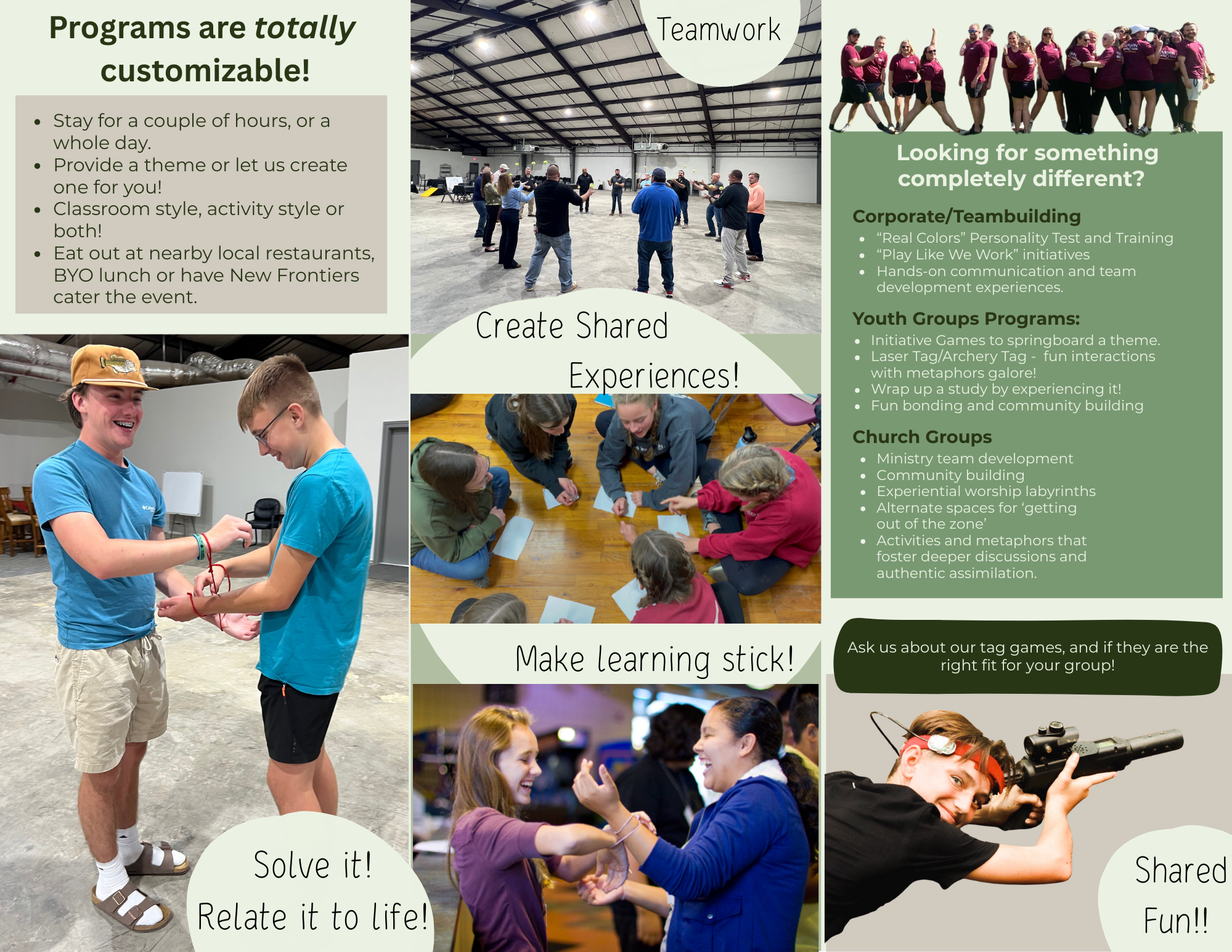 PIVOT Point is an office campus location currently located in Murfreesboro, TN. This program offers an opportunity for a Murfreesboro locals to run a day program of their choice! This can be anywhere from Pastoral meeting to a child’s birthday party. Customize your event with our different activity options like Initiative Games, Laser Tag/Archery Tag, Real Colors Test, and more. Call or email us today to book your event!